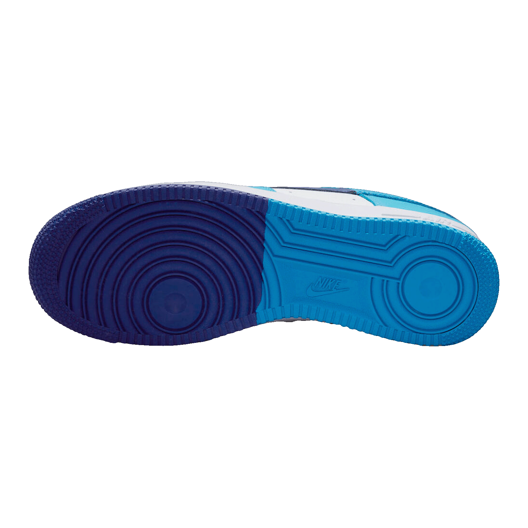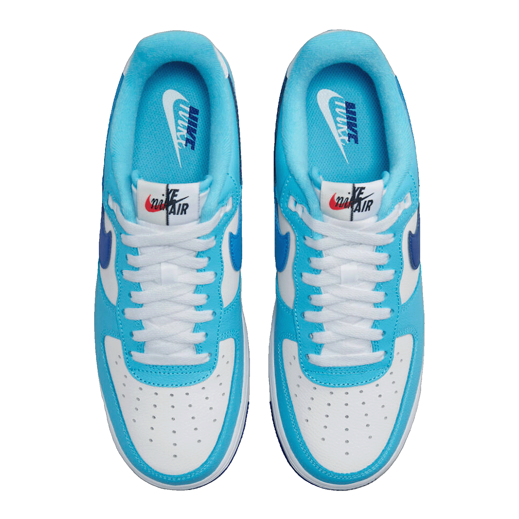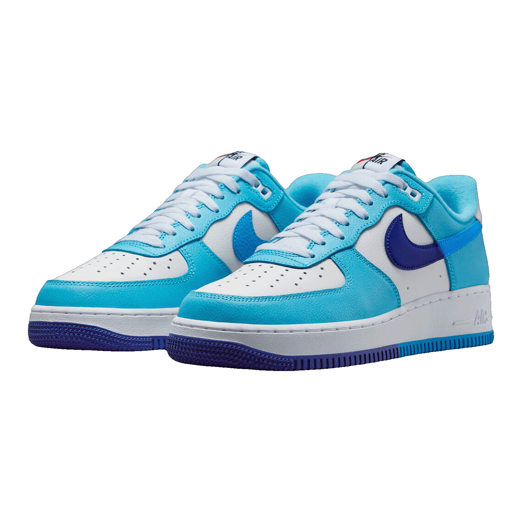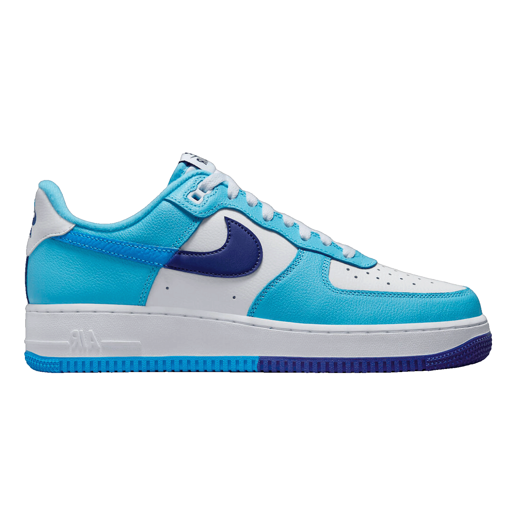 The Nike Air Force 1 Low '07 LV8 Split Light Photo Blue Deep Royal combines various shades of blue in a split design. This color scheme creates a dynamic and sporty look. Its unique design sets it apart from classic versions.